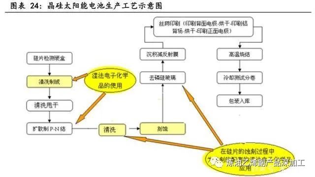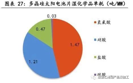 太陽能電池生產(chǎn)過程氫氟酸、氫氧化鉀、硝酸、雙氧水用量最大。單晶硅制絨工藝一般采用氫氧化鉀等堿性溶液作為腐蝕劑,配合鹽酸、氫氟酸進 行清洗。多晶硅采用硝酸、氫氟酸等混合酸液作為腐蝕劑,采用高純氫氧化鉀,氫氟酸+鹽酸混合液進行清洗。近年來單晶硅片占比提升較快,單多晶產(chǎn)能市占比已從 2015 年的 2:8 變?yōu)?2018 年的 3.5:6.5。未來高效電池的市占比不斷擴大,預(yù)計單晶硅片市占比仍將繼續(xù)提升,太陽能電池領(lǐng)域氫氧化鉀、雙氧水需求將明顯增加。