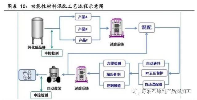 功能性材料混配工藝:功能性材料生產(chǎn)核心在于將純化后的成品進行精密混配,混配的關(guān)鍵在于配方,配方則需要根據(jù)不同客戶需求定制開發(fā),需要長時間的調(diào)配、試制、上線測試。