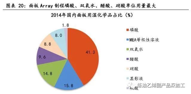 面板 Array 制程磷酸、雙氧水、醋酸、硝酸單位用量最大。在面板加工領(lǐng)域,需求量較大的濕電子化學(xué)品主要是:磷酸(41.3 %)、硝酸(24.06%)、 MEA 等極性溶液(15.8%)、醋酸(9.59%),主要在面板的蝕刻加工中充當蝕刻、清洗試劑。面板用濕電子化學(xué)品等級要求較半導(dǎo)體相對較低,但隨著平 板顯示向高世代發(fā)展,對產(chǎn)品的良率、穩(wěn)定性、分辨率、反應(yīng)時間等要求越來越高,相應(yīng)對高世代線用濕電子化學(xué)品的性能要求也越來越高。
