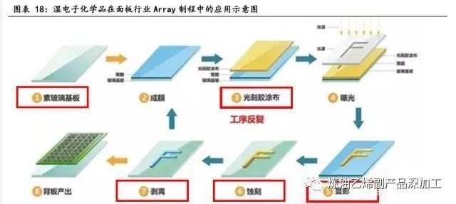 濕電子化學(xué)品主要用于 LCD 及 OLED 面板 Array 制程。LCD 及 OLED 面板生產(chǎn)工藝在 Array 制程(TFT 玻璃基板蝕刻)工藝流程較為類似。主要包括:TFT 玻璃基板清洗-沉積 ITO 薄膜(氧化物半導(dǎo)體薄膜,用于后續(xù)蝕刻)-涂 布光刻膠-曝光、顯影-蝕刻-光刻膠剝離。所需濕電子化學(xué)品主要包括基板 清洗用清洗劑;光刻膠稀釋劑;顯影劑;刻蝕液;剝離液等。
