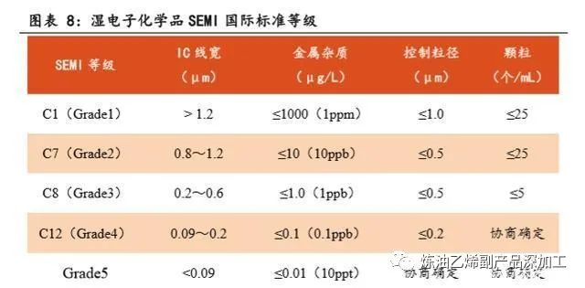 但隨著國家對濕電子化學(xué)品行業(yè)的政策扶持,以及國內(nèi)主流企業(yè)上市融資順暢,資金瓶頸不斷緩解,目前國內(nèi)濕電子化學(xué)品行業(yè)技術(shù)不斷提升,頭部企業(yè)部分產(chǎn)品等級已經(jīng)可以達到 G4、G5 等級。